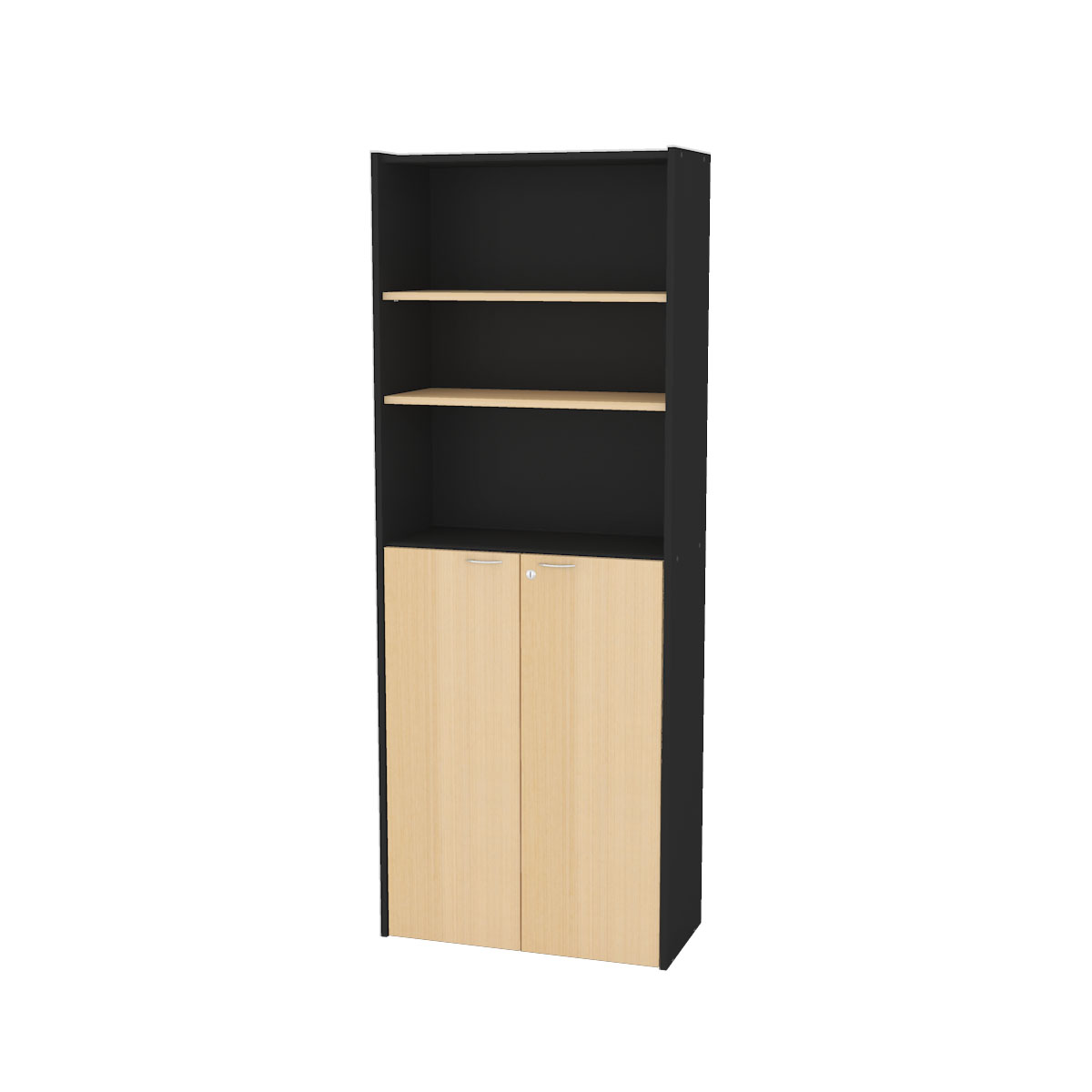 Biblioteca alta con puertas bajas, estantes móviles y fijos.