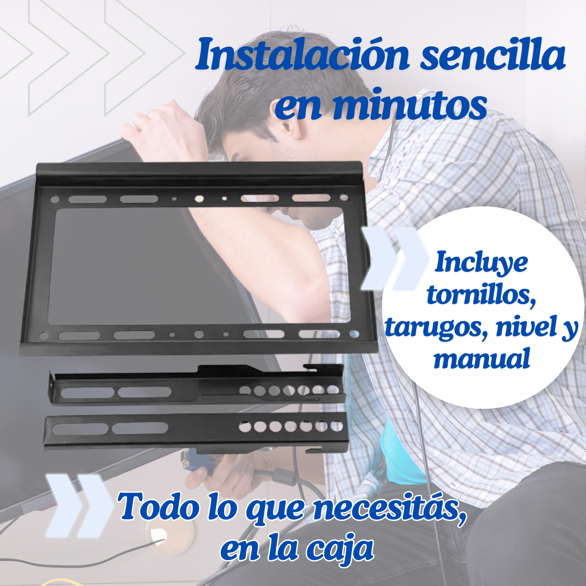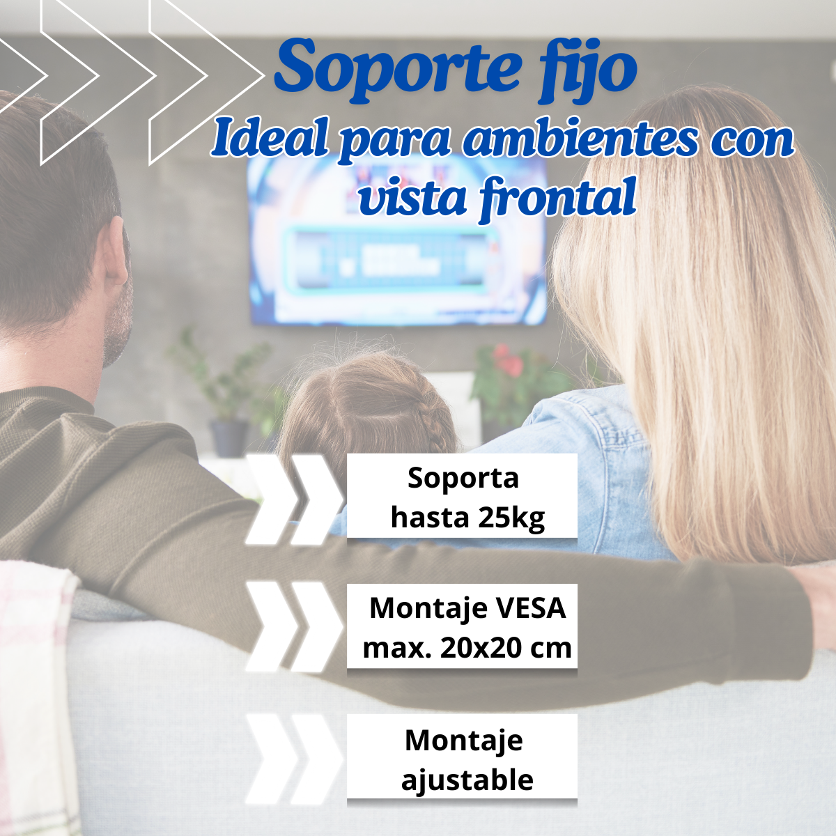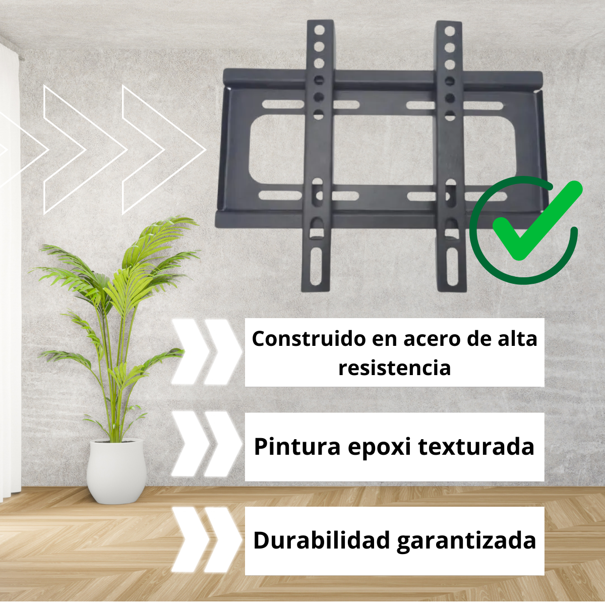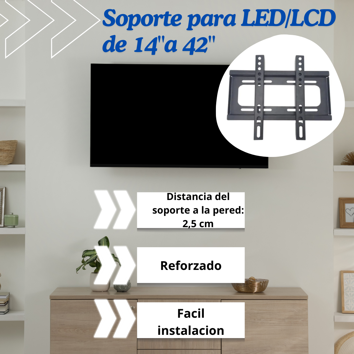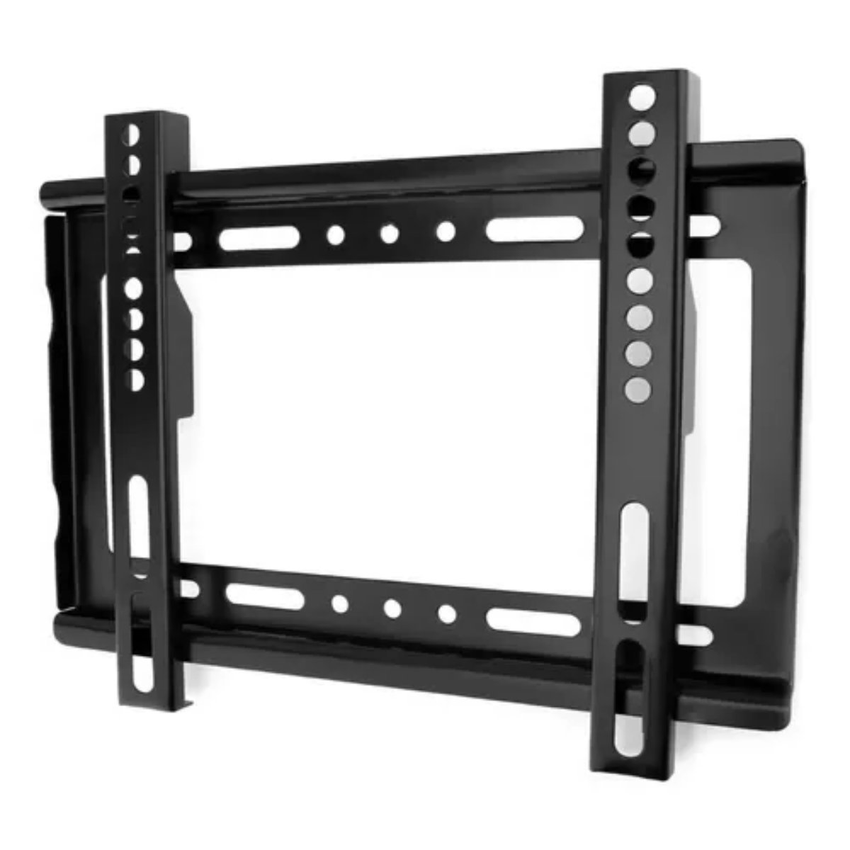 Soporte fijo para tv de 14″ a 42″. Soporta hasta 25 kilos. Montaje ajustable. Incluye nivél. Montaje VESA: máximo 20×20. Distancia de la pared: 2.5cm.